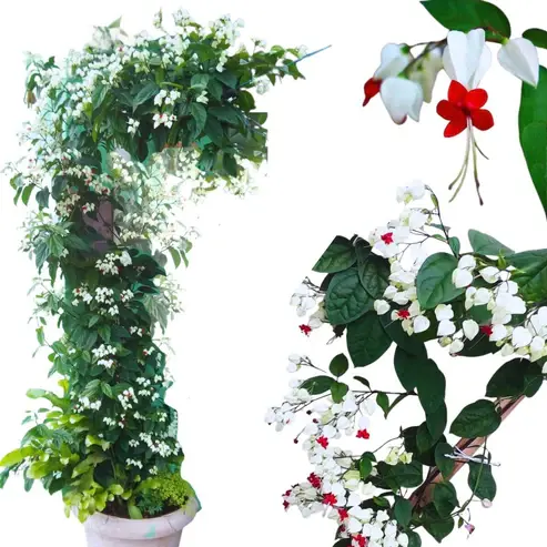The Bleeding Heart Vine (Clerodendrum thomsoniae) is a tropical, evergreen climbing vine known for its showy red and white flowers. It's a fast-growing plant that thrives both indoors and outdoors, particularly in warmer climates. The vine features glossy, dark green, oval leaves and produces clusters of flowers with white calyxes and crimson corollas.